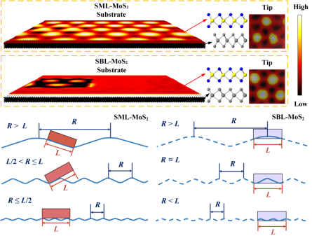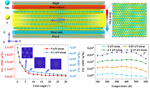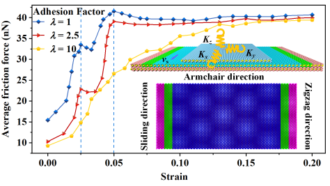 制造业发展的一个重要趋势是精密化和小型化,微纳器件因具有大比表面/界面结构,其摩擦和传热特性对机械系统的可靠性和产品使用寿命等尤为重要。从本质上揭示摩擦传热机理,实现能量输运的主动调控,已经成为亟待解决的课题。作为实现结构超滑的有效手段,应变工程能通过改变晶格结构或界面接触质量来调控摩擦力。通常认为,施加应变会使二维材料的摩擦力单调下降。然而,该团队的研究挑战了这一认知:在单层与双层二维材料中均发现了摩擦力的非单调变化,并揭示了两者背后不同的物理机制。在双层应变中,晶格失配诱导的摩尔界面粗糙度使得能量仅在搓板频率耗散;而在给单层施加应变时,应变引起摩尔表面粗糙度和强界面作用,形成了新的摩尔声子耗散通道。搓板频率和摩尔搓板频率的耦合增强与摩尔粗糙度非单调变化的共同竞争作用,导致摩尔纹尺寸接近摩擦副尺寸或其一半时摩擦能耗出现凸峰。此外,该团队还发明了一种由摩尔超晶格诱导的热开关,能够通过调控摩尔纹结构周期性和局部应力场,选择性地调节热流传输效率。